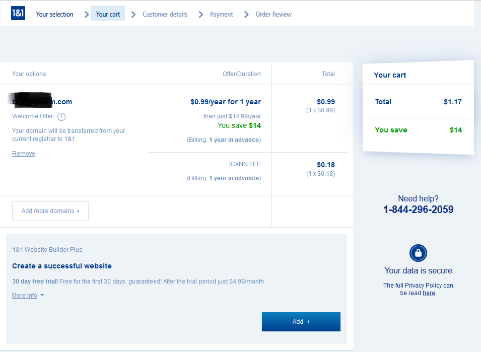 Their offer shows $0.99 for .com domains, with a free whois protection. Yet, when you add a .com domain to cart, all of a suddent you see $8.99 instead of $0.99. What a bunch of crap.